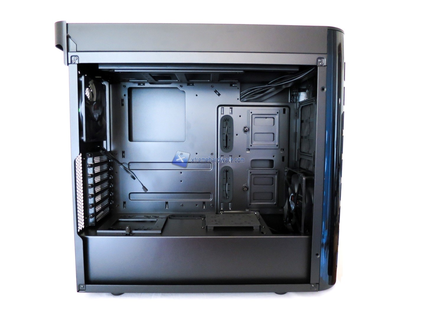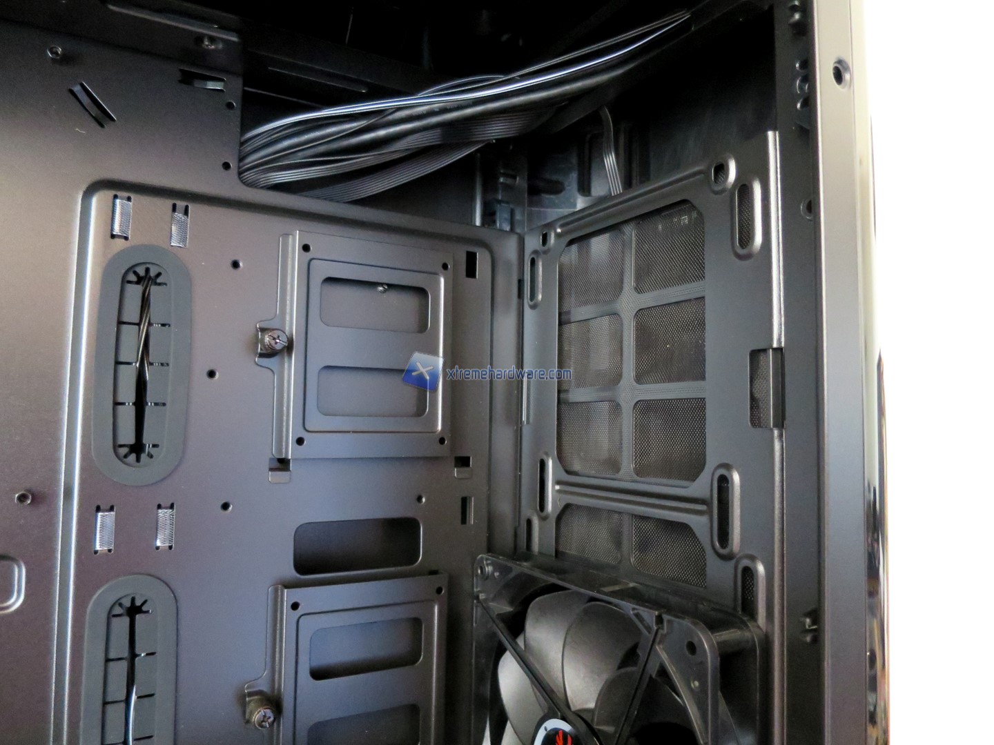 Rimosse le paratie possiamo accedere alla zona interna del Pandora ATX. Subito notiamo la diversa disposizione dei cage e in generale del layout. Ovviamente sono state apportate modifche minime. infatti il Midplate è sempre presente come anche i diversi fori laterali di destra oltrechè i fori con inserti in gomma. Dimensioni interne valide e buone per un’installazione di una valida configurazione di fascia alta.