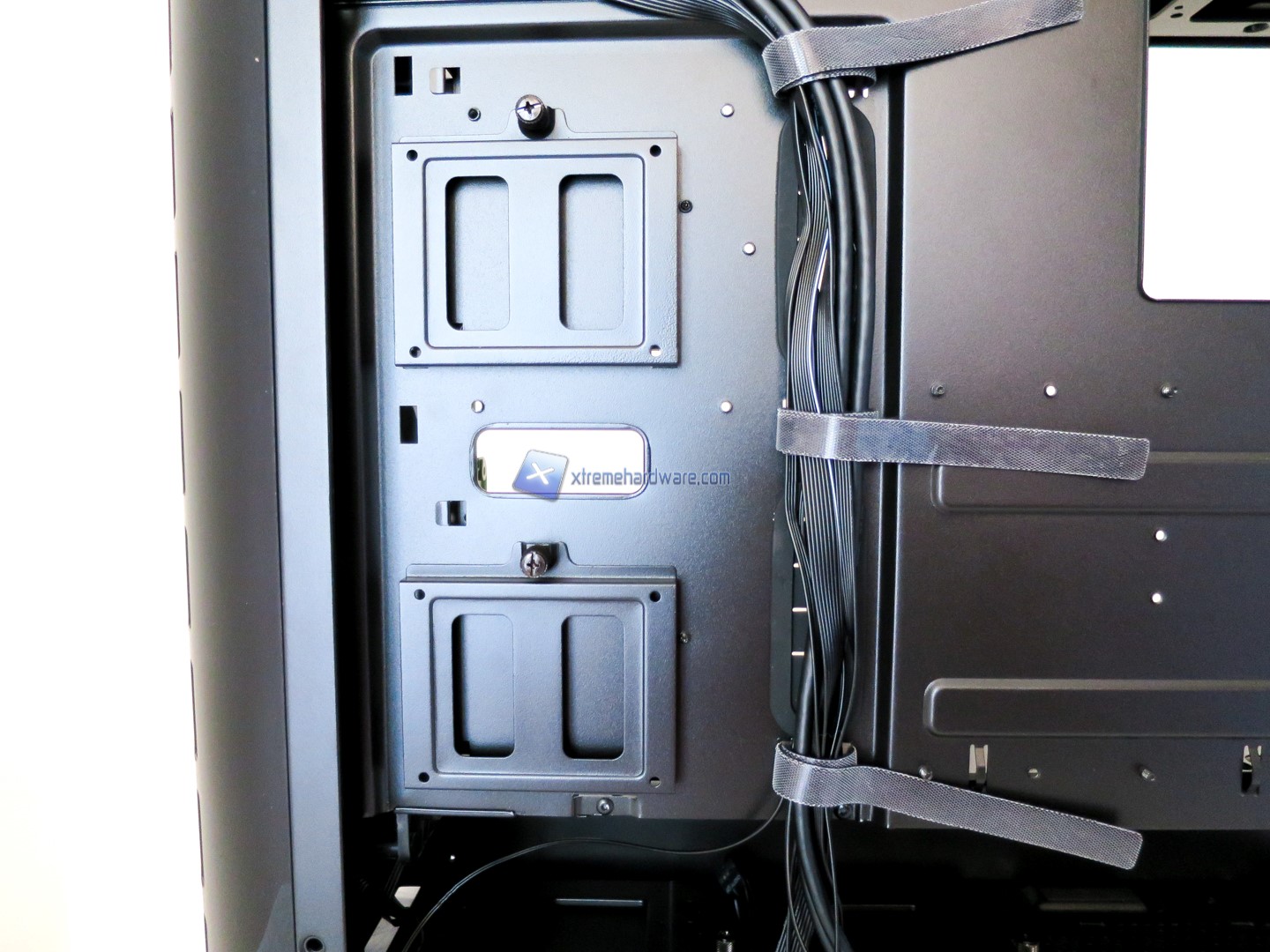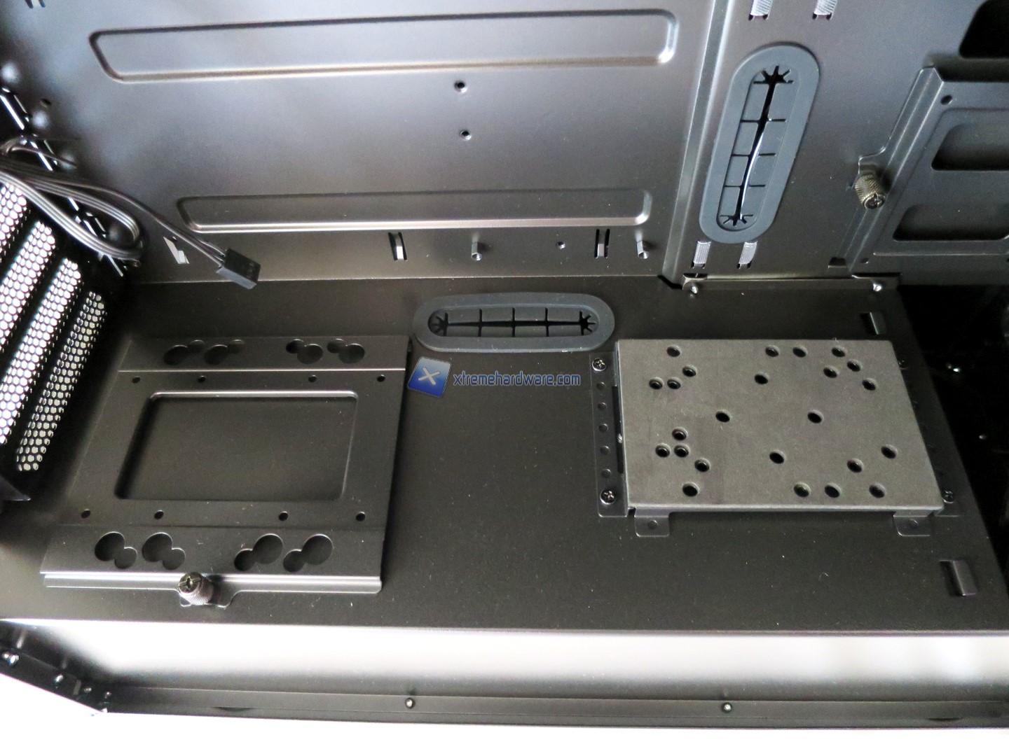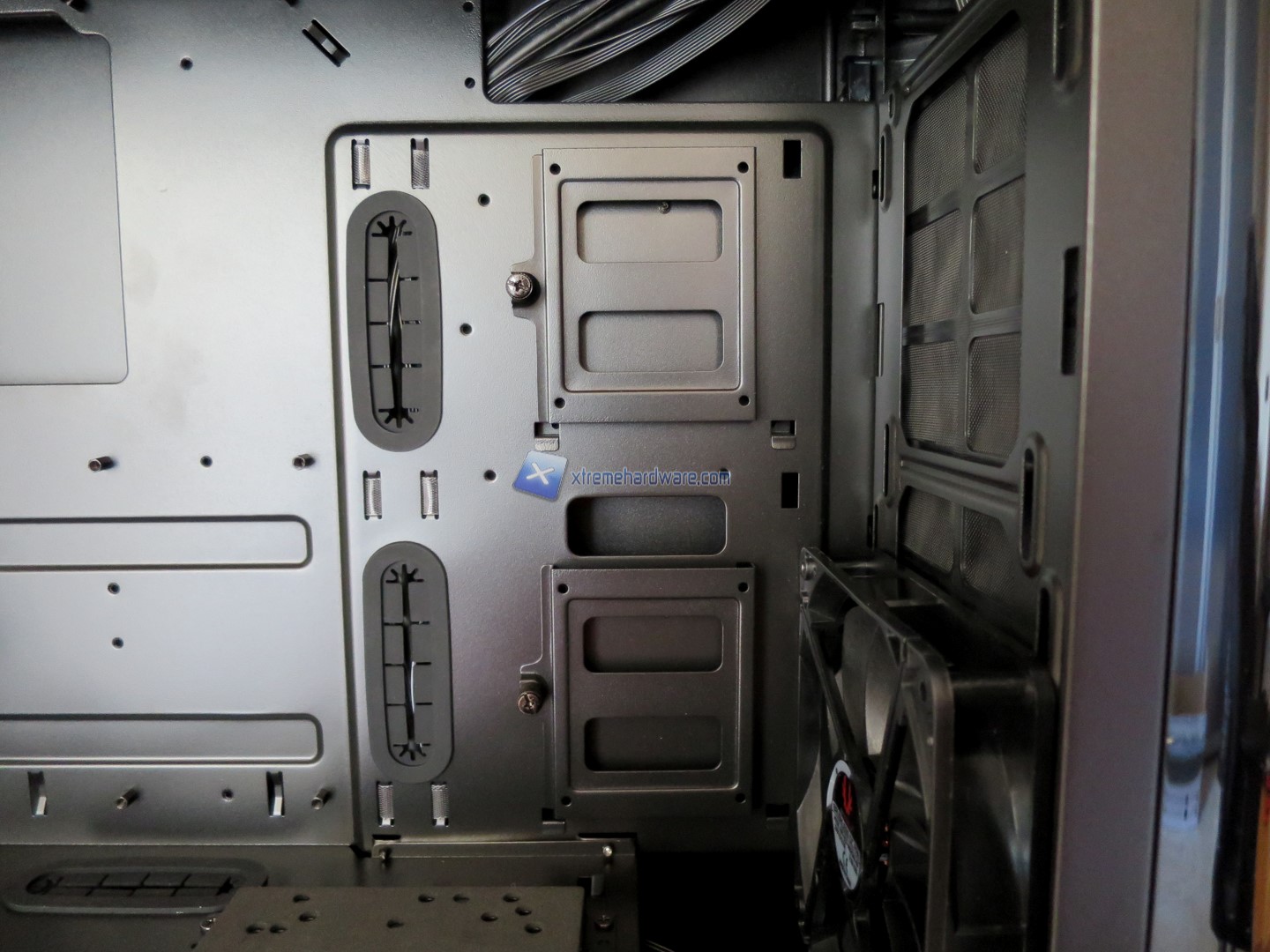 Tutto intorno troviamo la prima serie di fori dotata di inserti in gomma per il passaggio dei cavi dell’alimentatore. A lato di questi ultimi troviamo non solo altri fori orizzontali privi di inserti in gomma ma anche due supporti per l’installazione di SSD o con una rotazione e sostituzione di tali supporti anche drive da 3,5’’. Infatti possiamo notare i fori leggermente più distanziati per l’installazione del tray/supporto per tali drive. BitFenix con il Pandora ATX ha dunque pensato ad una buona e valida modularità di tali supporti.