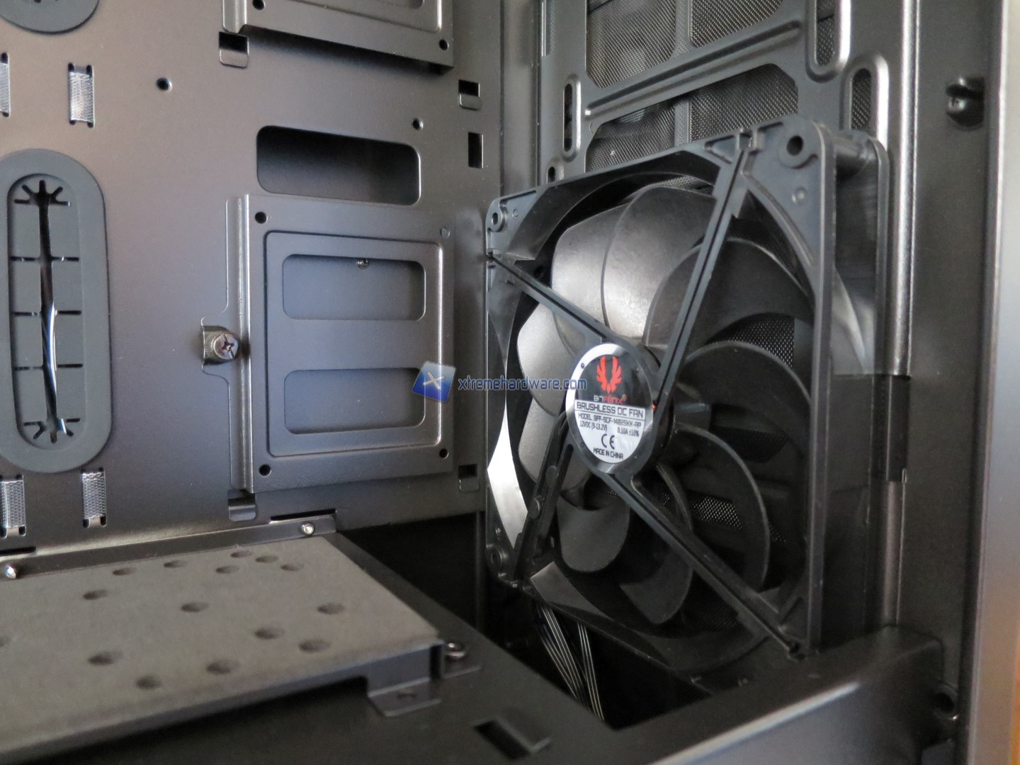 Nella zona di destra, in corrispondenza dei suddetti, troviamo la ventola da 140mm BitFenix classica che aiuterà il ricircolo d’aria. Da osservare la presenza dei fori per eventuali ventole.